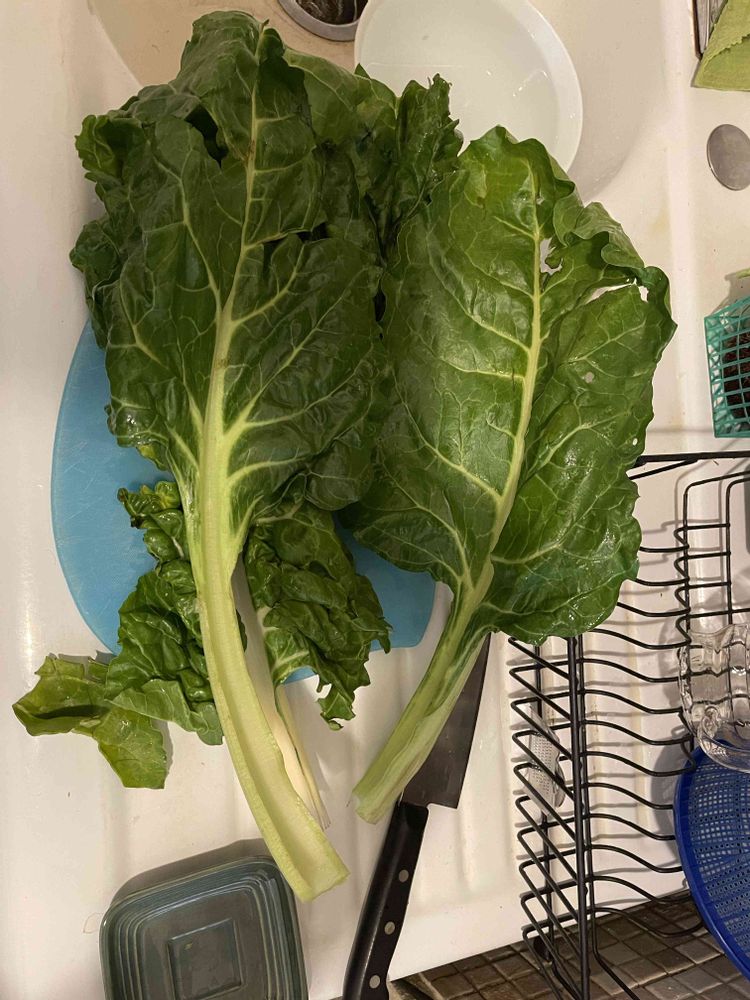 先日、大きな葉を食べ残った小さな葉といっても、写真のようにかなり大きい物を、今日いただきます。