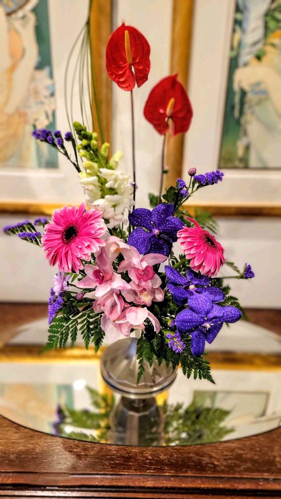 こんばんは、すごいですね。すごい素敵です。はじめ見た時、後ろの絵が2枚見えたので、どこかの展示会のアレンジメントかなぁ?なんて思いましたが、コメント読んでびっくり‼️ お花の名前スラスラ書けるのはご自身で活けてるから当然ですよね。