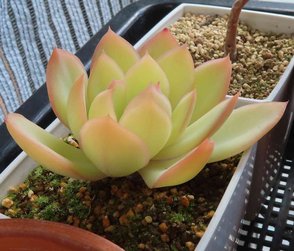 葉挿しで増やしたパリダプリンスの一つが,4日前に投稿したピーチプリデのような黄色に紅葉してきた。