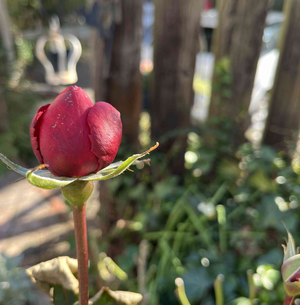 ❺イングリッドバーグマン🌹コロコロ蕾。剪定しなきゃだけど、なんかほころんできたし、咲くのかな?