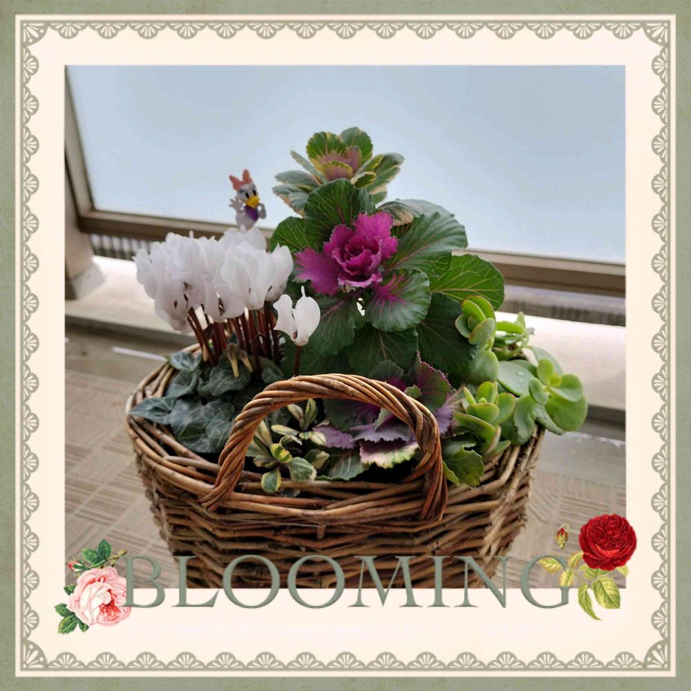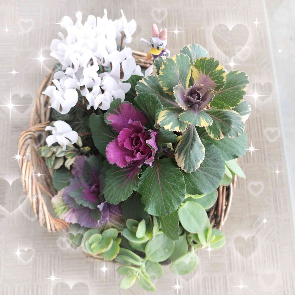 1枚目~以前ミルさん🎁の🧺に葉牡丹寄せしてみましたᕦʕ •ᴥ•ʔᕤ ガーデンシクラメン🤍沢山蕾も付いてるし元気に育つと嬉しいな~😊💞