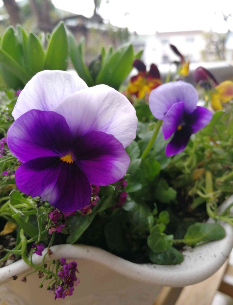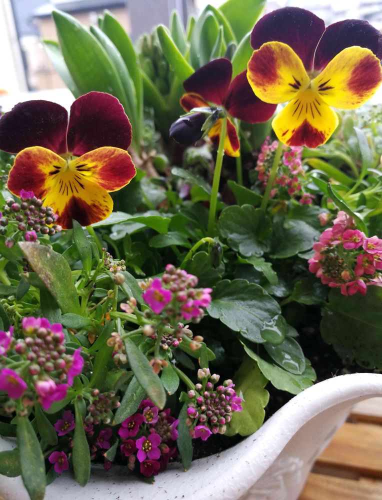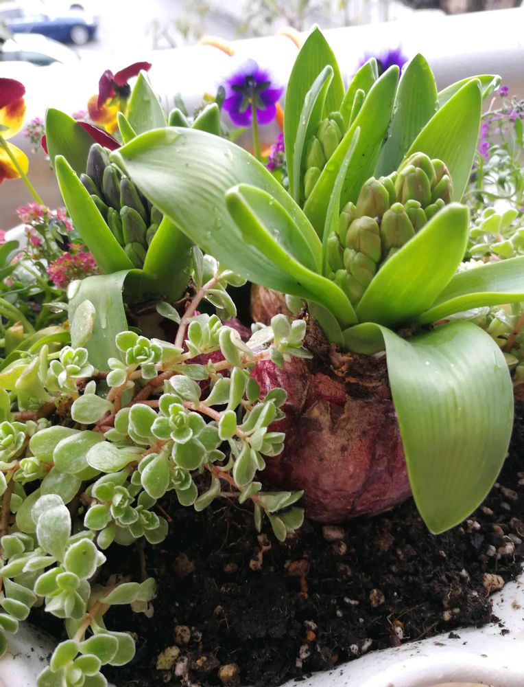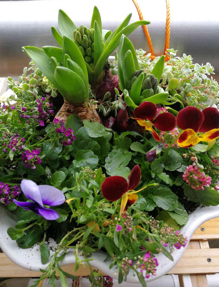 ビオラ、アリッサムに後方のセダムと盛りだくさんに囲まれたヒヤシンス🪻🪻🪻良いですね〜✨