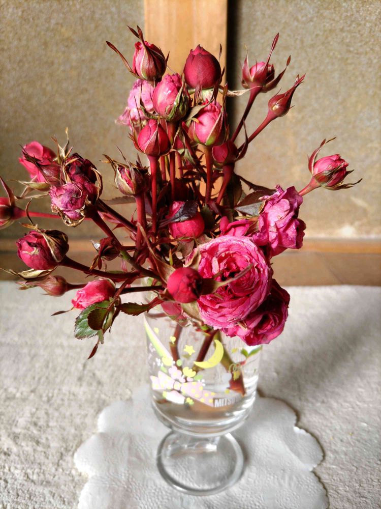 ①剪定した薔薇を昭和の三ツ矢サイダーのグラスに🌹🍷
