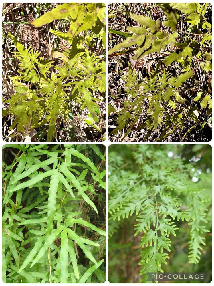 ↙️が普通の栄養葉、↘️が夏から秋にかけてつく胞子葉で、通常の葉よりずっと裂片が細かく裂けています。