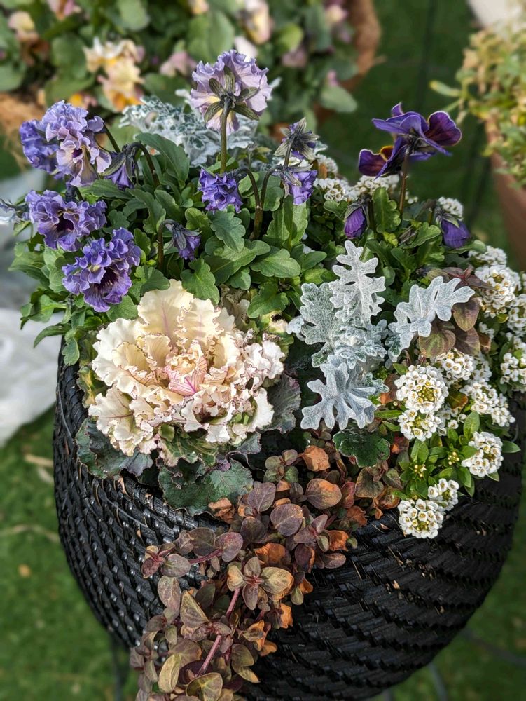フレアブルーの寄せ植え、正面にオシャレ葉牡丹を持ってきたのにビオラがそっぽ向いてる😂