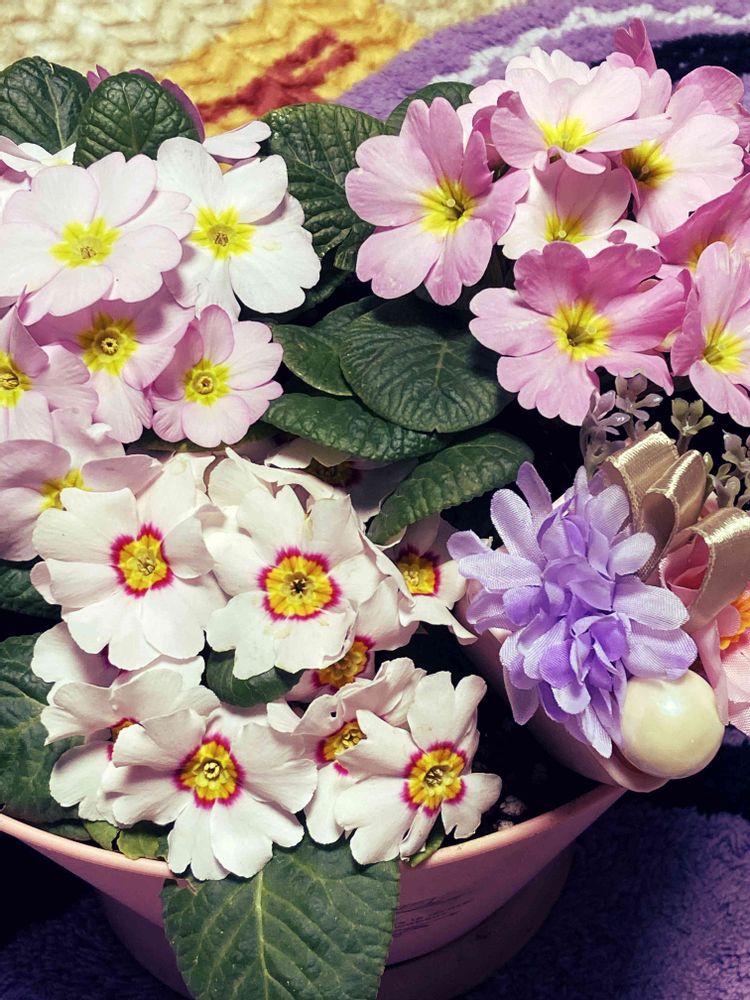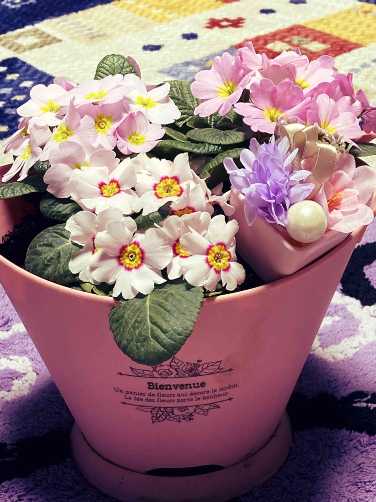 おはようございます😊プリムラジュリアンだけで寄せ植えしました🌸ピンク🩷色に揃えてちょこんとダイソーさんの花ポット乗せました😊