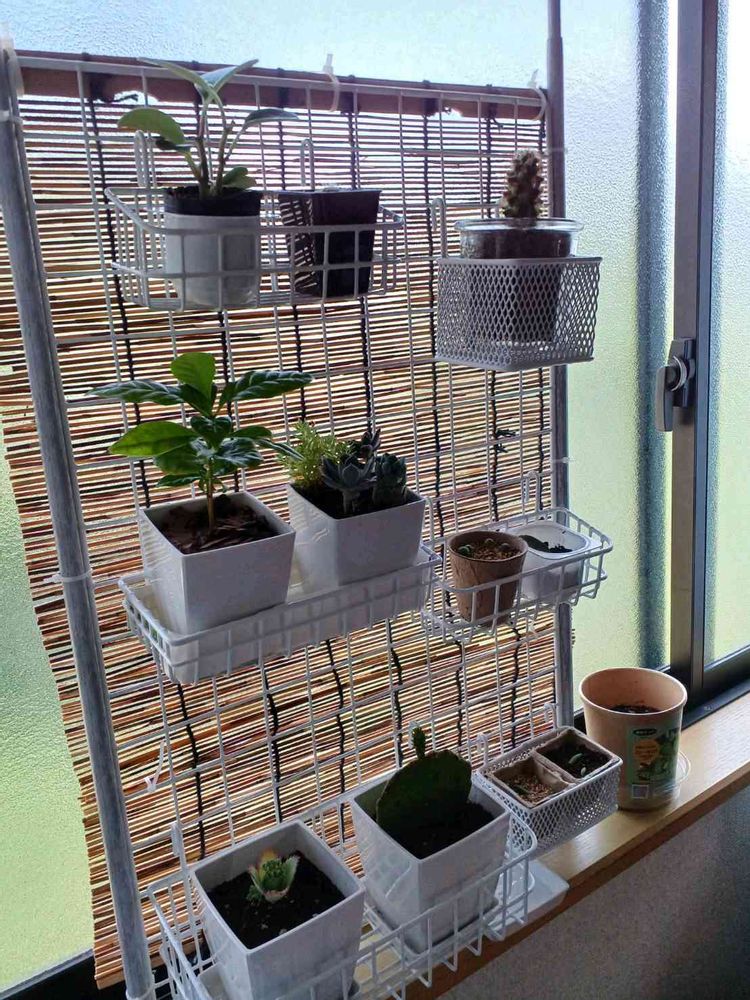 ベランダも賑やかになり、ここにもDAISOで作ったラックに植物を置き始めました。