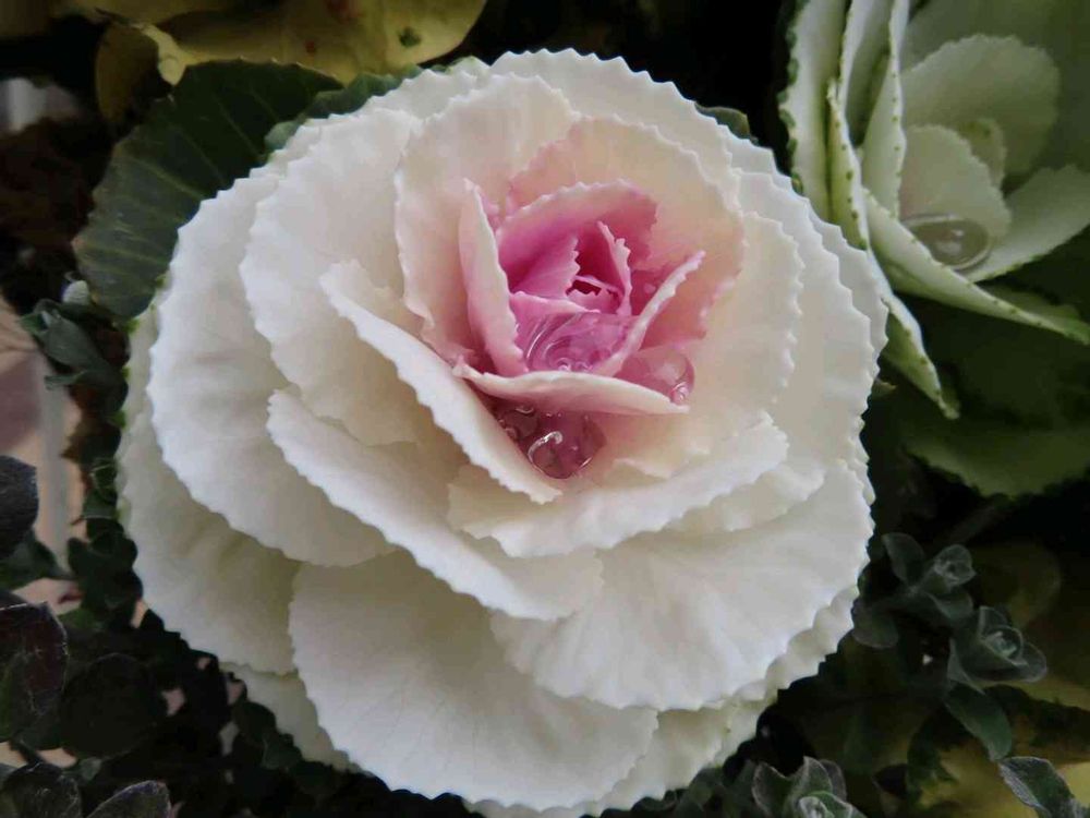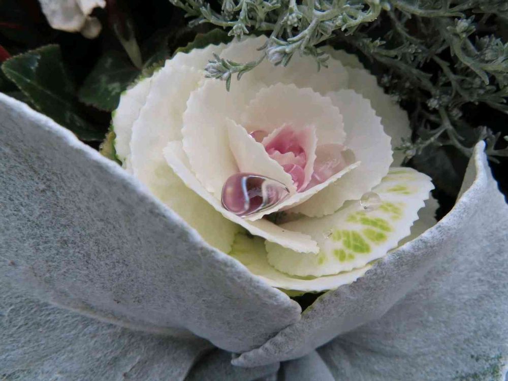 寄せ植えのハボタンに付いた雨粒がキラキラと素敵でした。