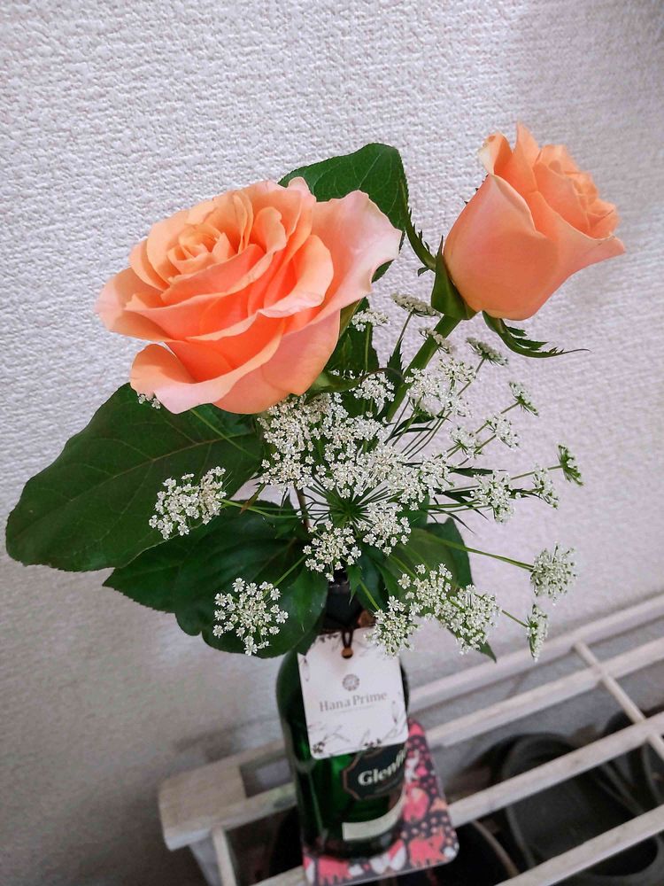花瓶は ツル性の水挿し🌱用に使ってて😅 ちょっとオシャレなお酒の空き瓶に活けました🤭💦
