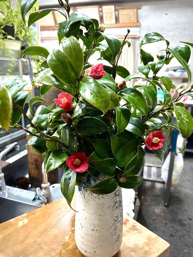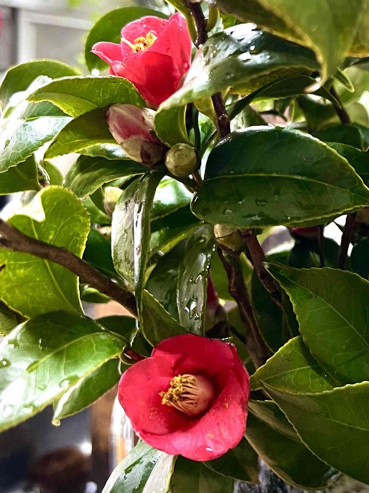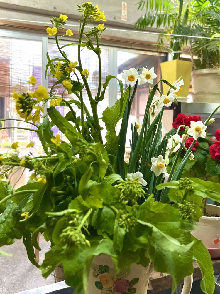 空が暗く鬱陶しくても今日は朝から薮椿の枝と水仙、菜の花の差し入れを頂き✌️ハッピー🍀