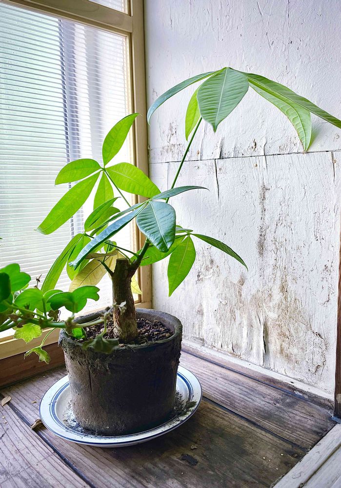お気に入りの古民家カフェの窓辺にひっそりと佇むパキラ🌿✨穏やかに優しく…そっと語りかけてくれる😌♡いっぱい素敵な時間をありがとね♪