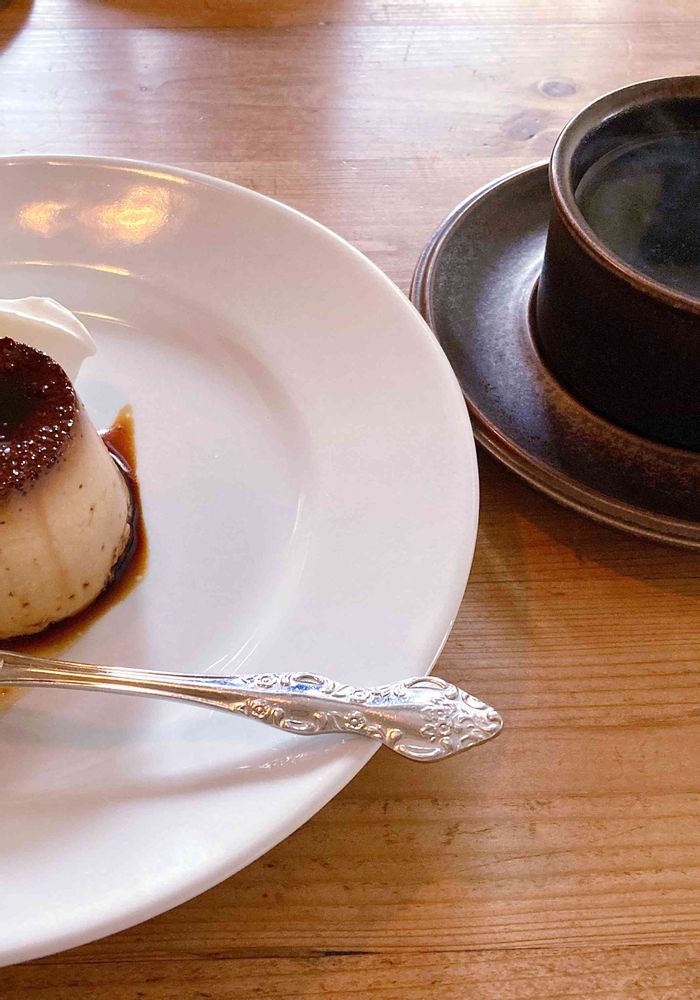 2枚目は…このカフェの人気メニューのプリン🍮固めでしっかりとした味わい😋✨コーヒーもすごくいい香り♡ARABIAのアンティークカップ☕️がより美味しさを引き立てます🤎