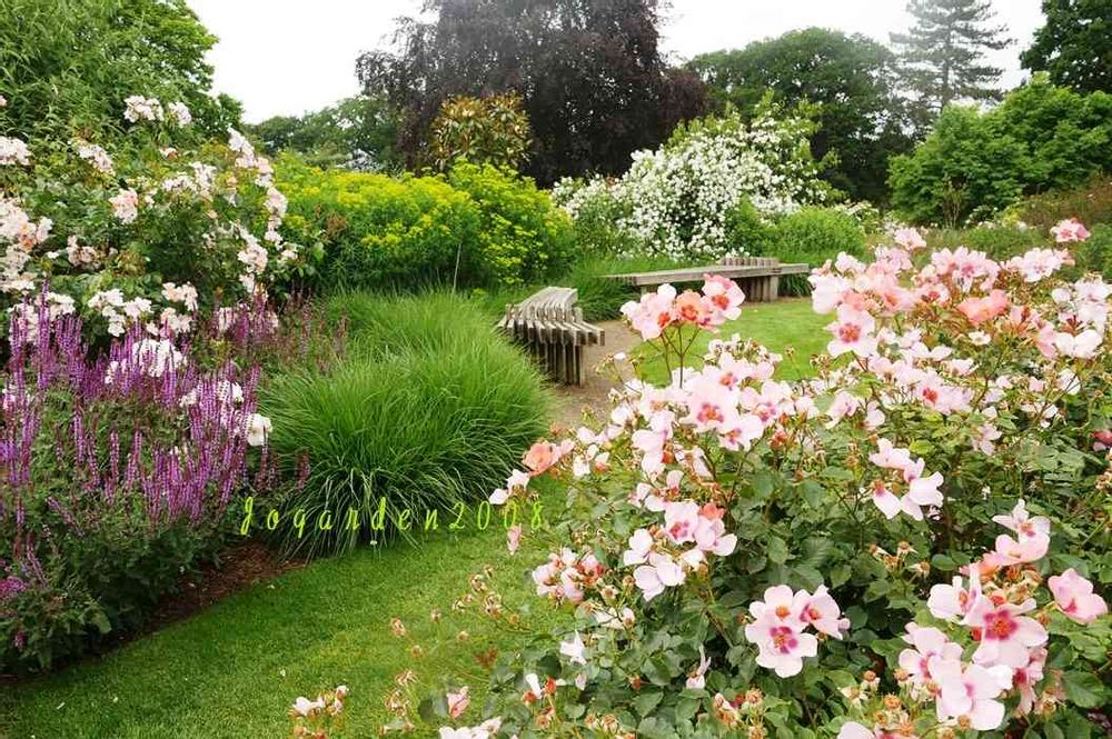 ウィズリーのロースガーデンは、バラが宿根草や芝生や白樺などと組み合わされて植栽されています。