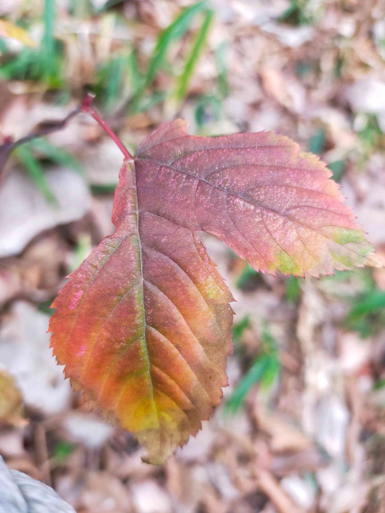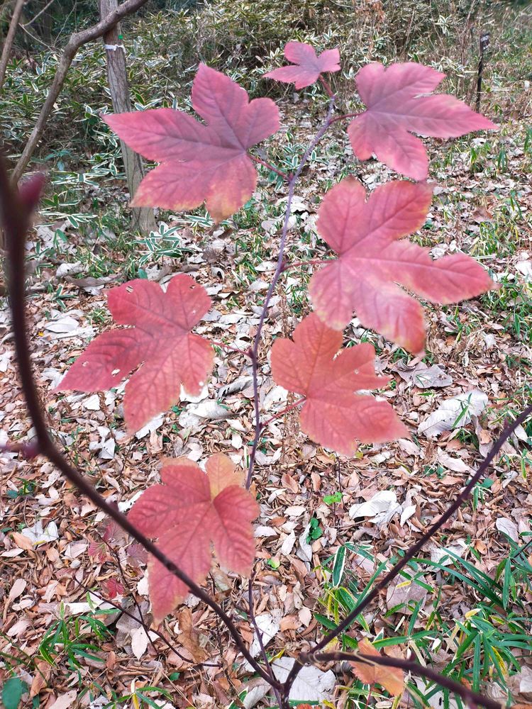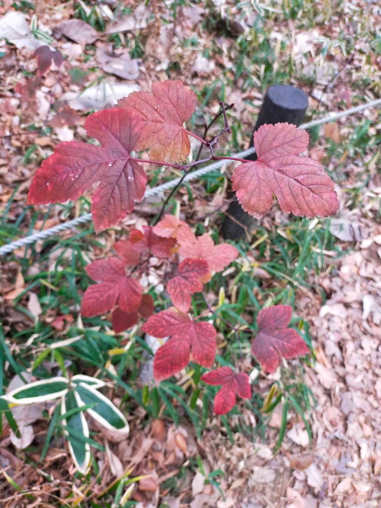 先日の投稿からさらに赤みが深まったヒメカジイチゴの葉っぱ