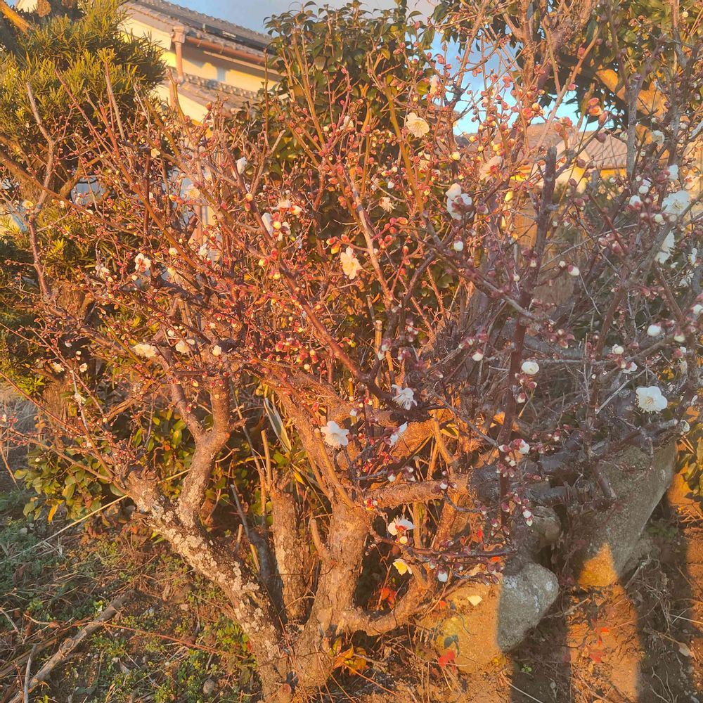 百年物の後継として実生えの梅も既に10年近くに 夕映えにチラホラでも寒さで交配してくれる虫は未だかな?
