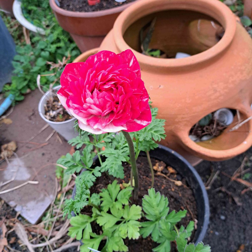 ABCガーデンズで購入した八重咲アネモネ バラの大苗を買うとき植わっている鉢を転用するのが縦長でちょうどよいかも このアネモネの鉢は河本バラ園のやつだったかな