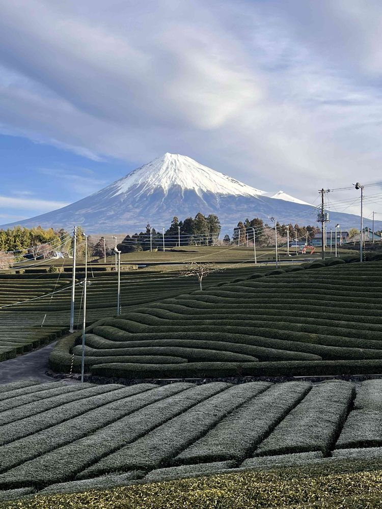 茶畑の黒いラインがとってもかっこいいです。畑のリズムが富士山と空を引き締めてね👍 デザイン画みたいです👏