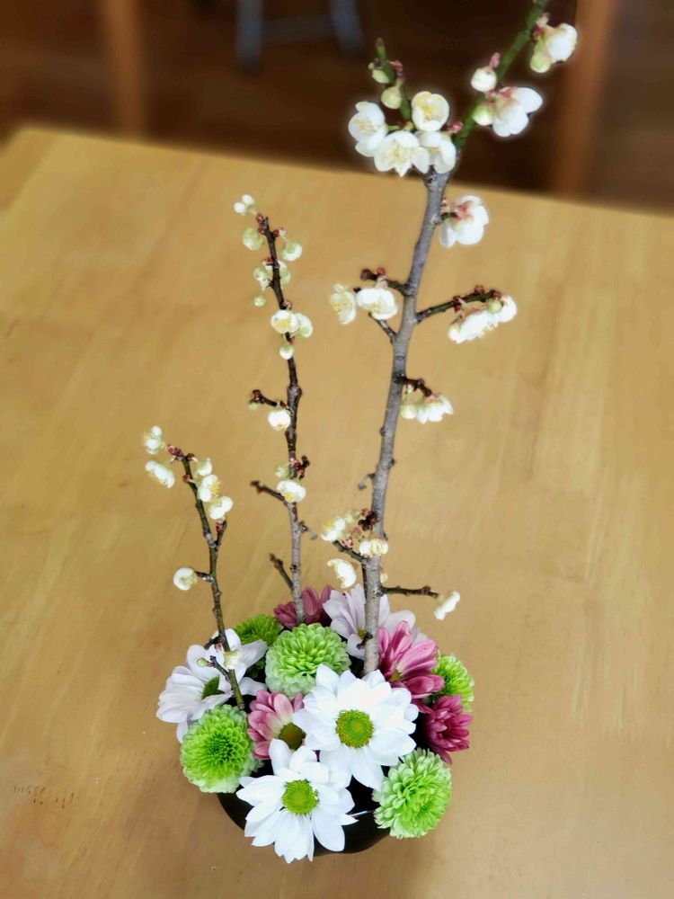 梅の花を売ってたので生けてみました。なかなか緑色に困る季節、小菊の緑を足元に。