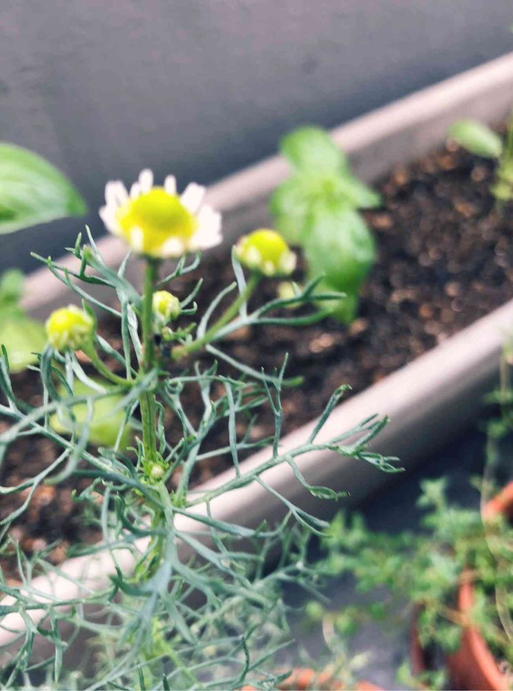 やっと咲いた春蒔きのカモミール 今くらいの風だと気持ち良さそう🍃