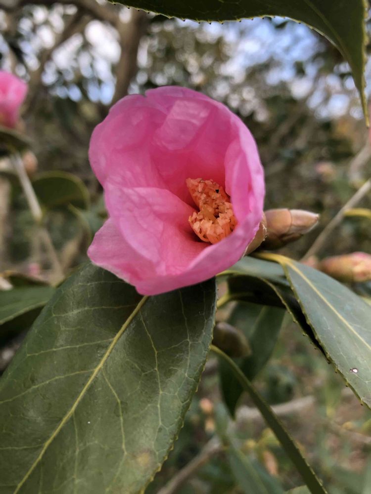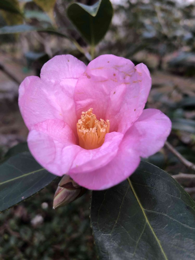 夕暮れ時、ピンク色のツバキ「太郎冠者」をパチリ!📸🌸🌿😄🌇👌