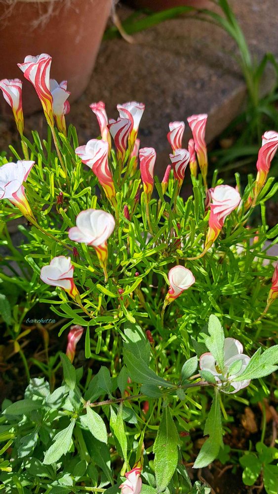 ちなみに学名を:Oxalis versicolor L.といいます。学名の明記ははラテン語と決まってますのでオキザリス・ベルシコロル。ベルシコロルは虹色とか玉虫色の意味です。英名ではstriped-flowered wood sorrel とかcandy cane sorrel。通称Barber's pole!つまり床屋の看板💈の呼び名があります。何かパーシーとは何処にもでてきませんねぇ😅
