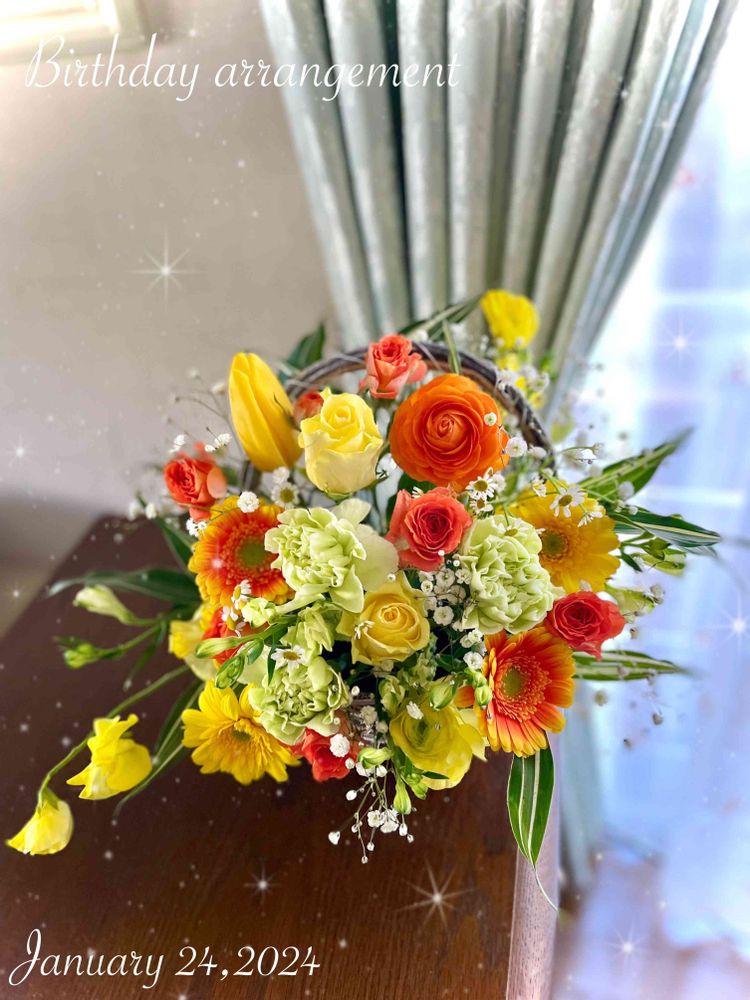 昨日 娘の誕生日にビタミンカラー💛🧡のアレンジを注文され、作ってみました😊