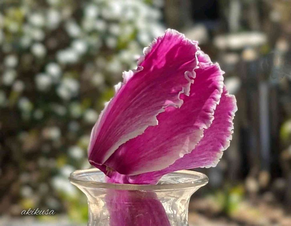 1️⃣今寂しい庭を補ってくれている玄関内外のシクラメンとガーデンシクラメンですが シクラメンの枯れた箇所を抜こうとして誤って抜いてしまった1本を器に挿してデッキで眺めていると 花弁のひらひらがとても繊細で美しく魅入ってしまいました