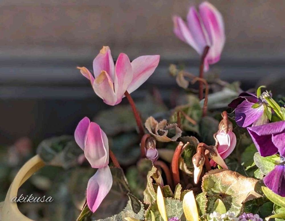 2️⃣外の寄せ植えの中のガーデンシクラメンは寒さにも負けずポッと頬を赤らめているように可愛らしく咲いてくれています