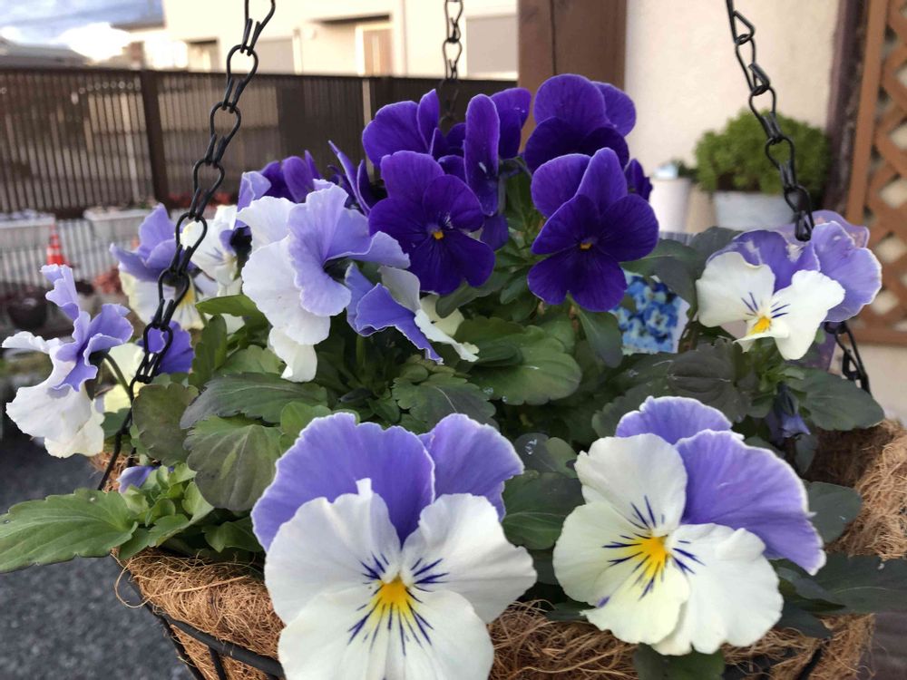 いつ植えたのか忘れましたが、パンジー わらくとマリアブルーオーシャンです。強風でも吊ったままなので、風に当たりすぎて裏側はハゲてます😅💦