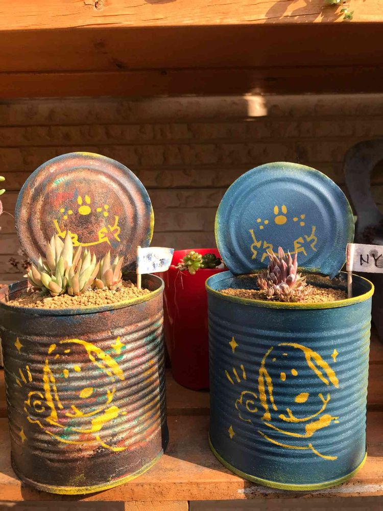 オロスタキス属 白雪爪蓮華とNYBGが大きくなってきて鉢が小さくなったので 蓋付きリメ缶SNOOPYバージョンを作って 植え替えしました´•ﻌ•`