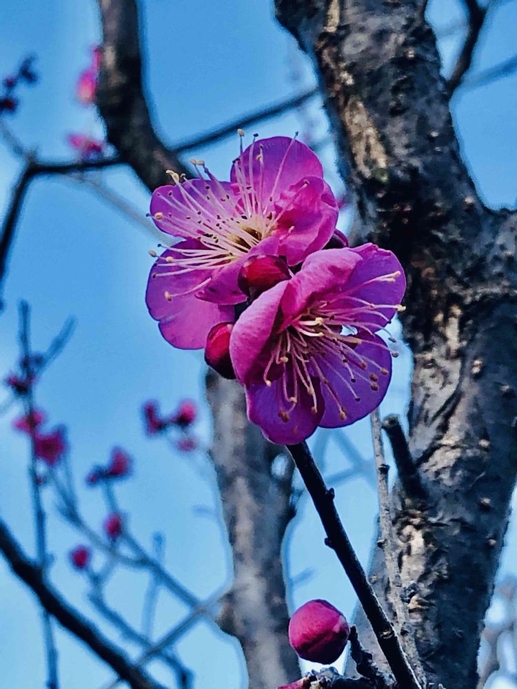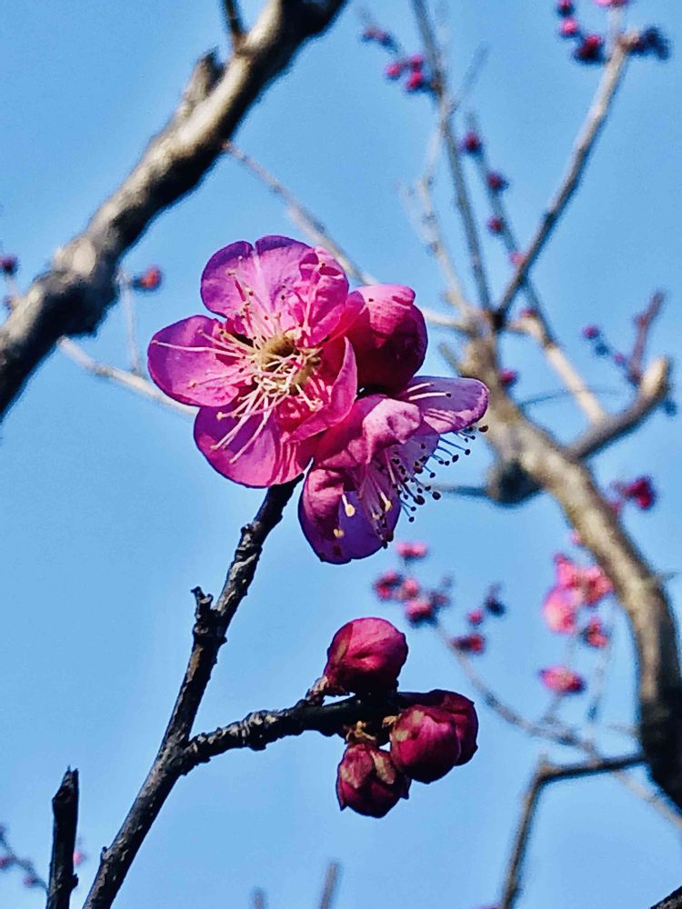 夕暮れ時、紅色の梅「肥後駒止(ひごこまどめ)」をパチリ!📸♥️😊