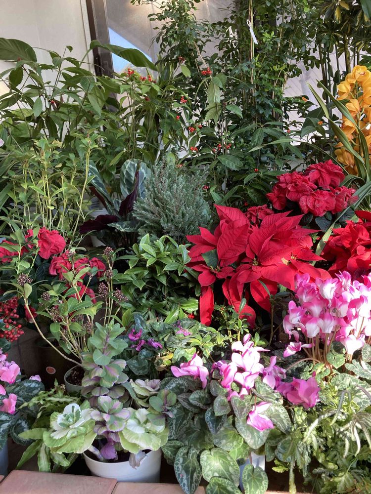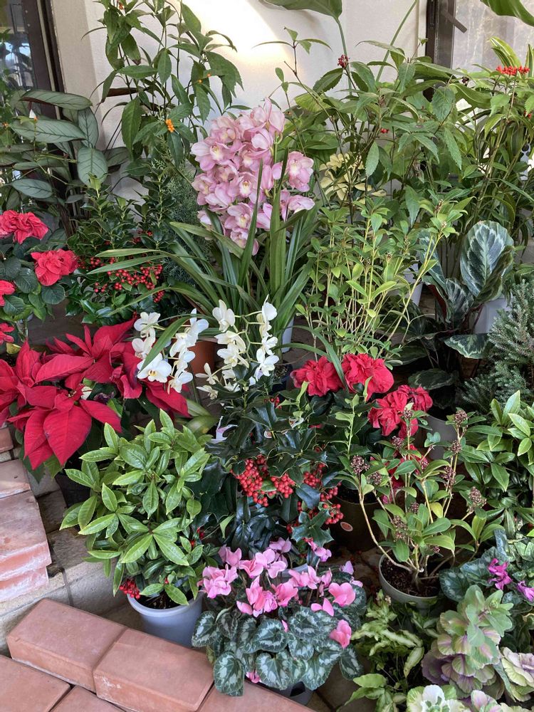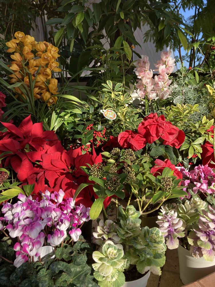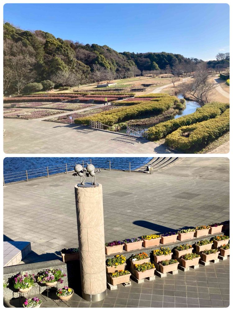 "21世紀の森と広場"パークセンター2階のサンルームの花々とテラスからの景観。