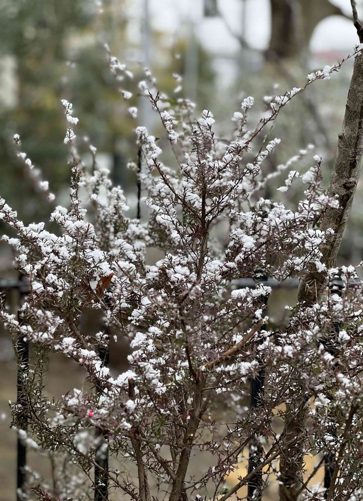 雪の花びら、いいでしょ?ギョリュウバイは葉っぱが細かいので雪が降るとこんなふうに積もるのですね☃️