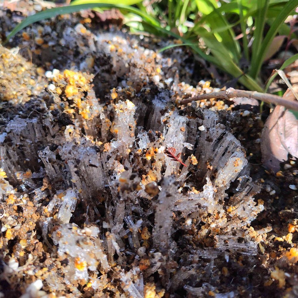 地面が盛り上がって3cmぐらいの霜柱が出来ていました🥶