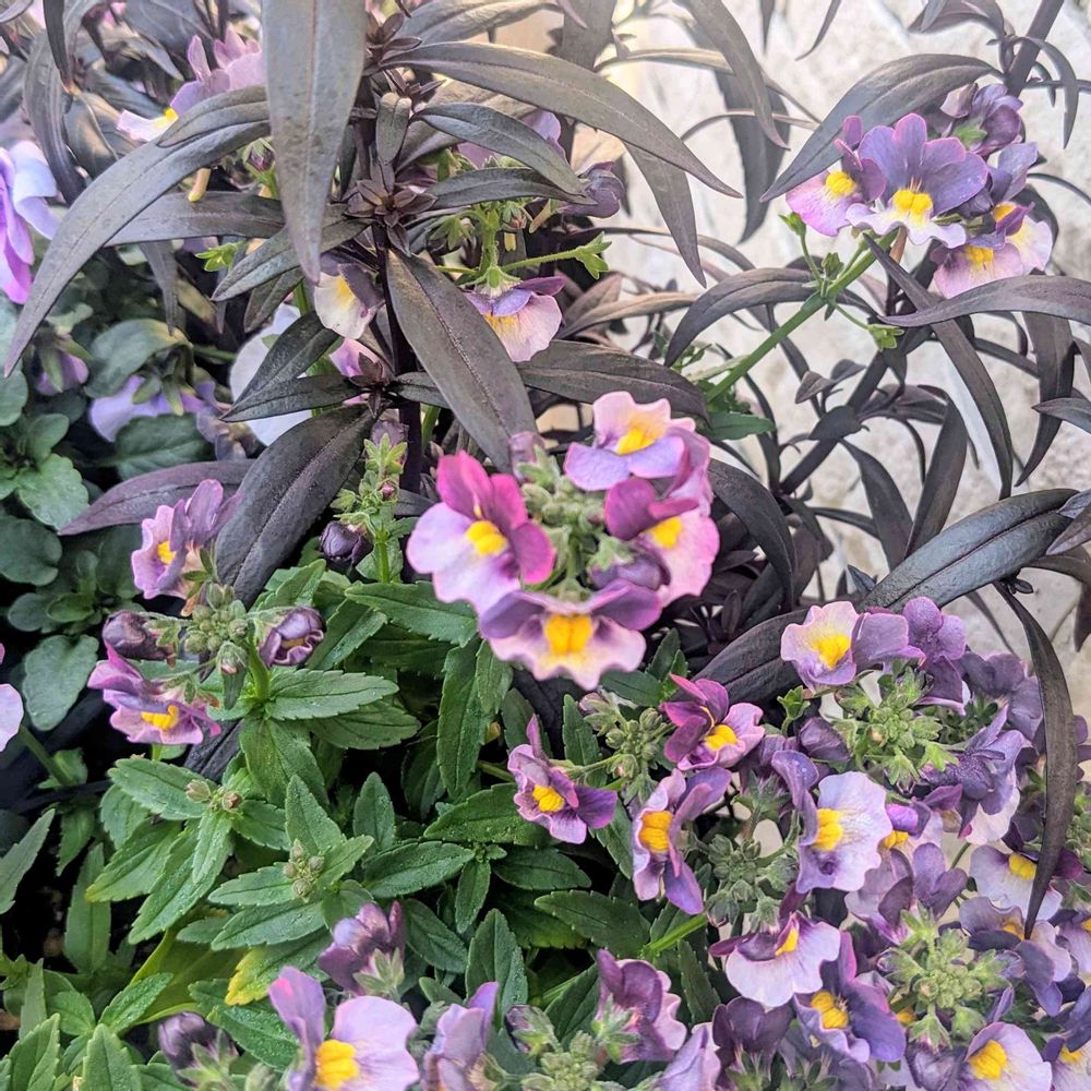 寄せ植えのネメシアブルーベリーパイとキンギョソウブロンズドラゴン、