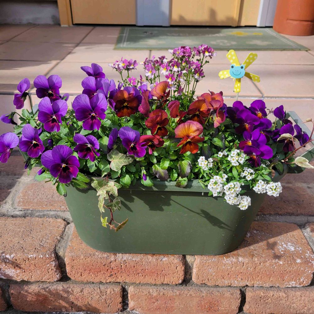 今年のメインの寄せ植えはこれなんですけど…みどりのまとめの【春が楽しみな寄せ植え🌷】の今季はバージョン‼️ビオラがなかなか咲き揃わなくて…バランス悪いけど何とか咲いてくれました☺️
