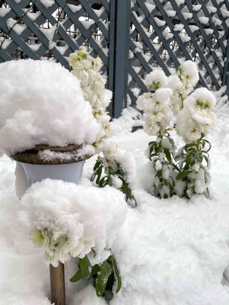 今日は晴れて、雪が一気に溶けたと思います!雪をまともに被った花壇のストックも、元気を取り戻していました❣️