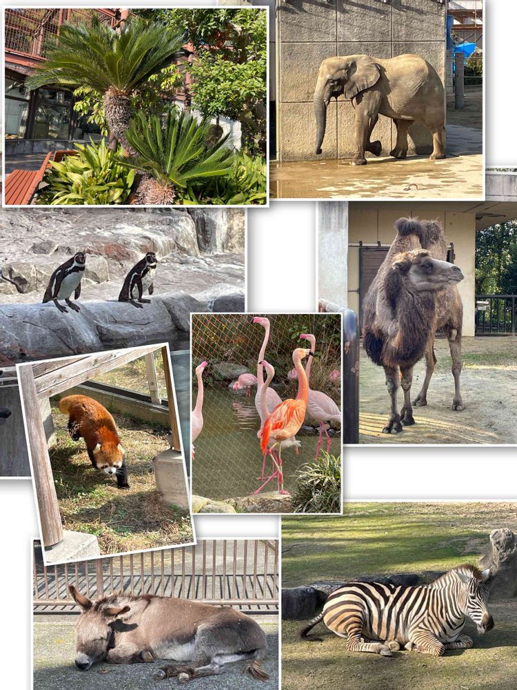ゾウ🐘、ペンギン🐧、フタコブラクダ🐪、レッサーパンダ(娘が大好き♡ かわいいですよね)、フラミンゴ🦩、ロバ🫏 (気持ちよさそうに寝てました💤)、グラントシマウマ🦓 (偽物と思うぐらい 他のコも動かず)