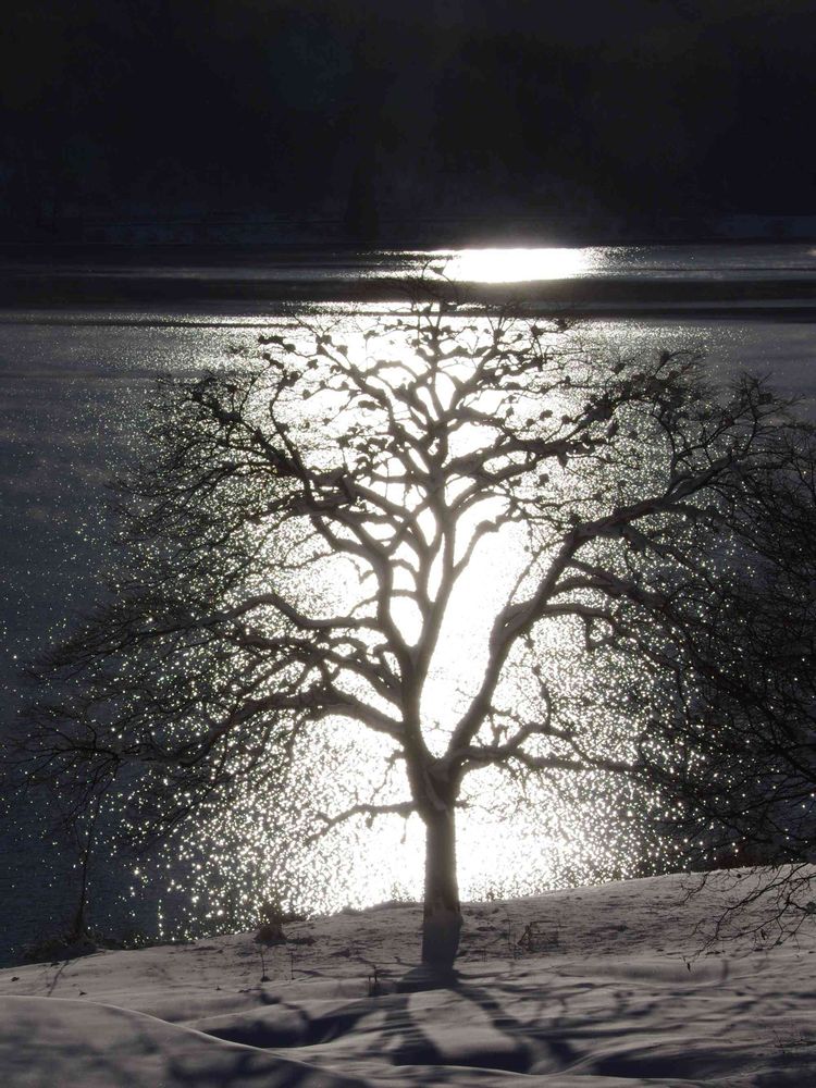 湖畔の雪の上に立つ木が朝日の反射をバックにシルエットになりました✌️
