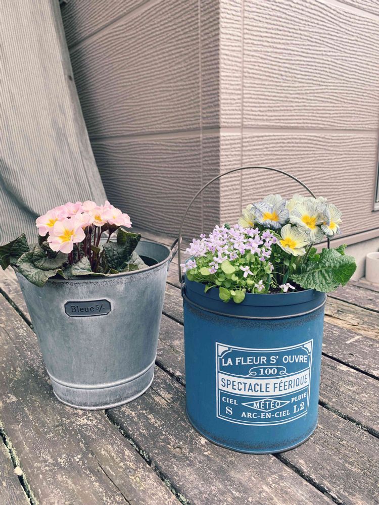 銅葉プリムラの方には先週お迎えした水仙を2つブルーのブリキの方は
