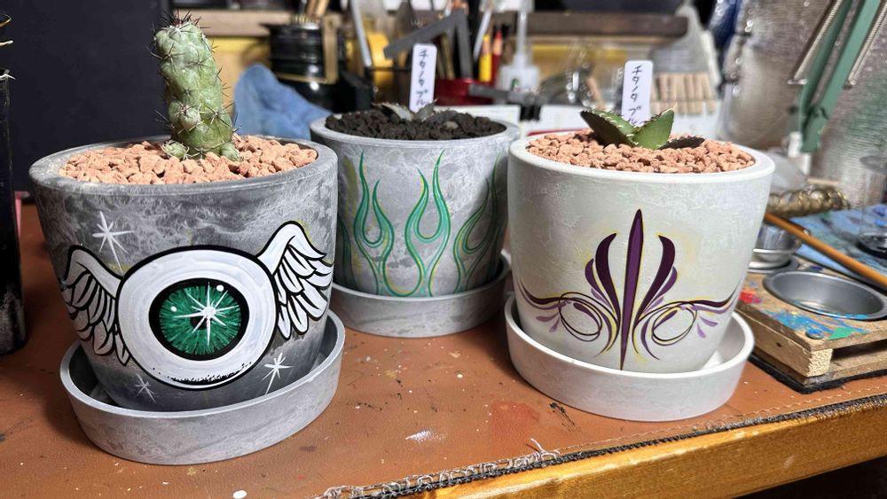 嫁の母上もアガベに興味を持ってくれてあーだこーだ話ながら色々見て回って育ててみたいと言うのでとりあえず手軽に手が届く実生のブルーとマクドガリーを母上選抜でお出迎え!植え替えを任されてせっかくなので鉢にもペイントして準備OK!👌