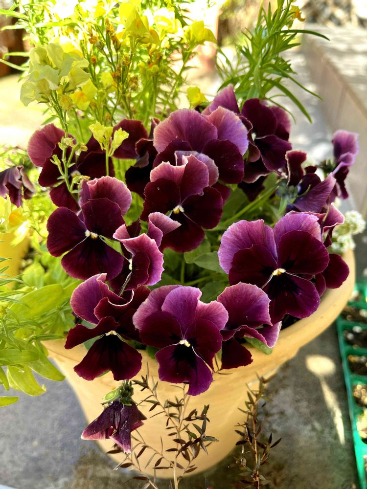 パンジーの紫色💜が暗〜く重たい色になってしまうので明るくしたら、春の夕日のような色合いになってしまった😂