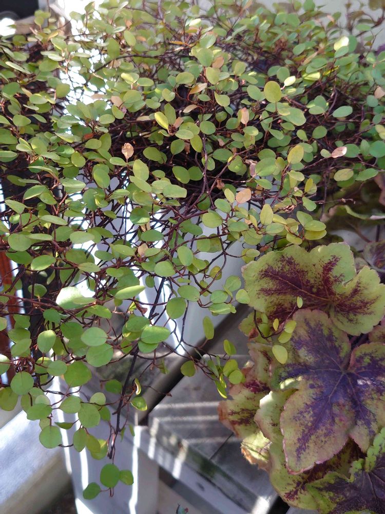 冬でも葉っぱを残しているワイヤープランツさん😊🌱✨お隣のヒューケラさんと「今日も寒いね〜🌿」とお話ししているみたいです(⁎˃ᴗ˂⁎)💚