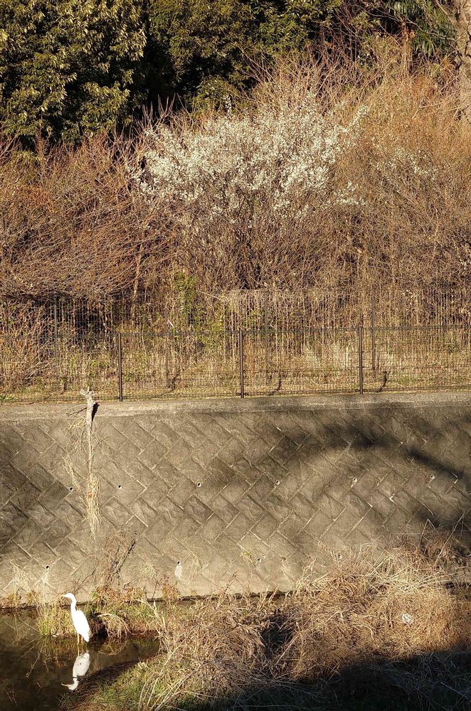【1枚目】おっ、今日もサギくん発見🧐 と、対岸に白い花が満開😮 梅かな?