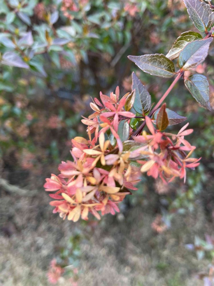 遊歩道脇にアベリアの街路樹が長く続いています。花期が長く、白い可愛いお花を咲かせていましたが、このピンク色のは、紅葉した葉っぱ?