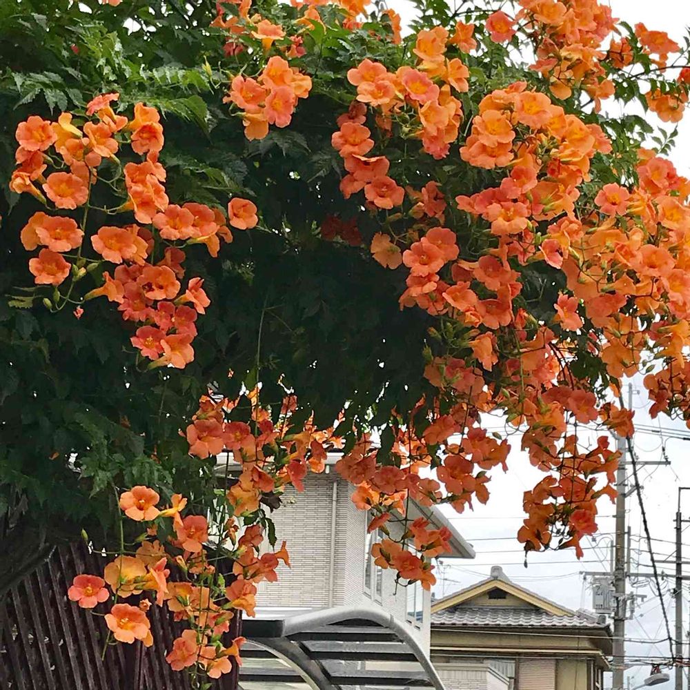 鈴なりって感じですね❣️オレンジの花が青空に映えてます😱ポタポタ落ちるのま困りますよね💙💜