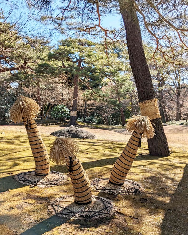 庭園の雪吊を作った時にワラボッチも冬の庭の何も無い所に庭師さんの遊び心でしょうか