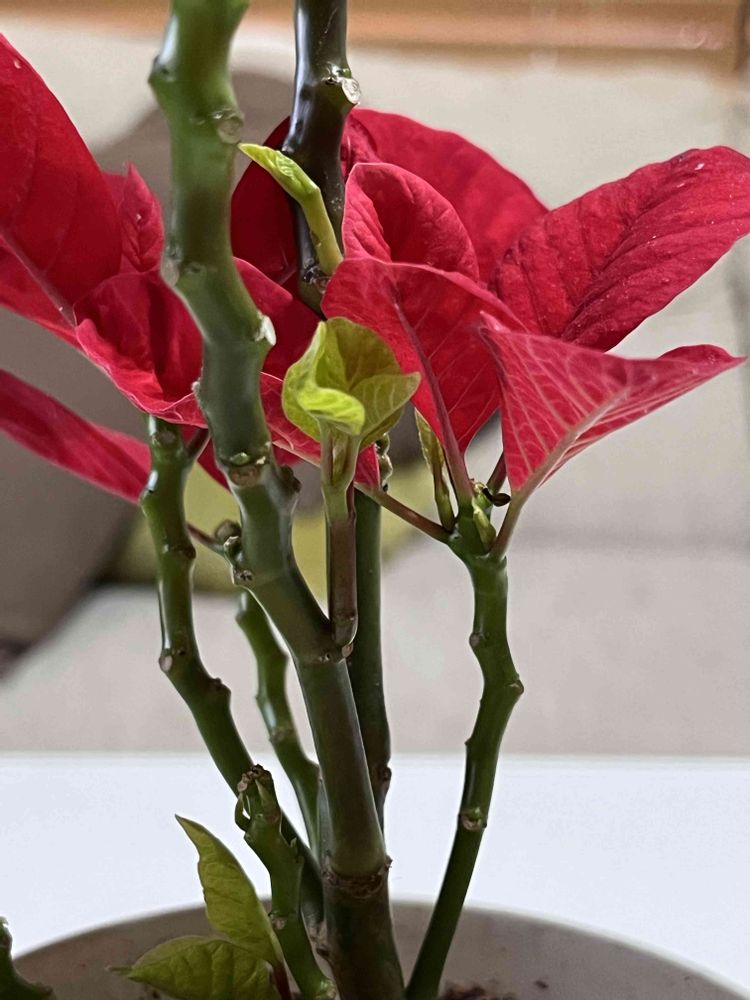 あんなに真っ赤で綺麗な葉をつけていたポインセチアさまでしたが、、、、🥹なんと、😳😳😳新芽🌱🌱🌱なんとか枯れないで育って欲しいです❤️❤️❤️❤️