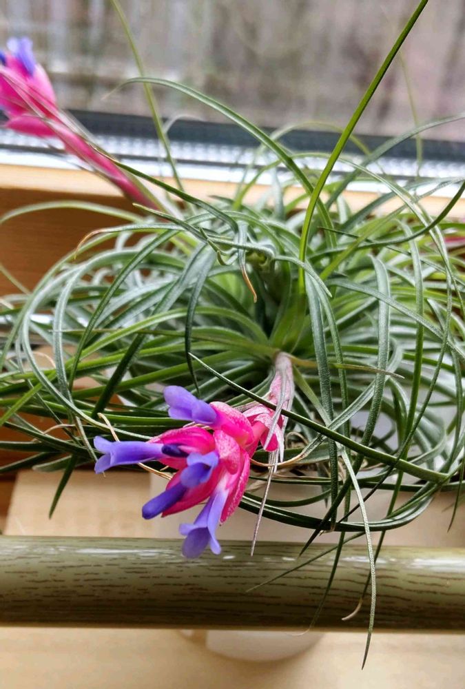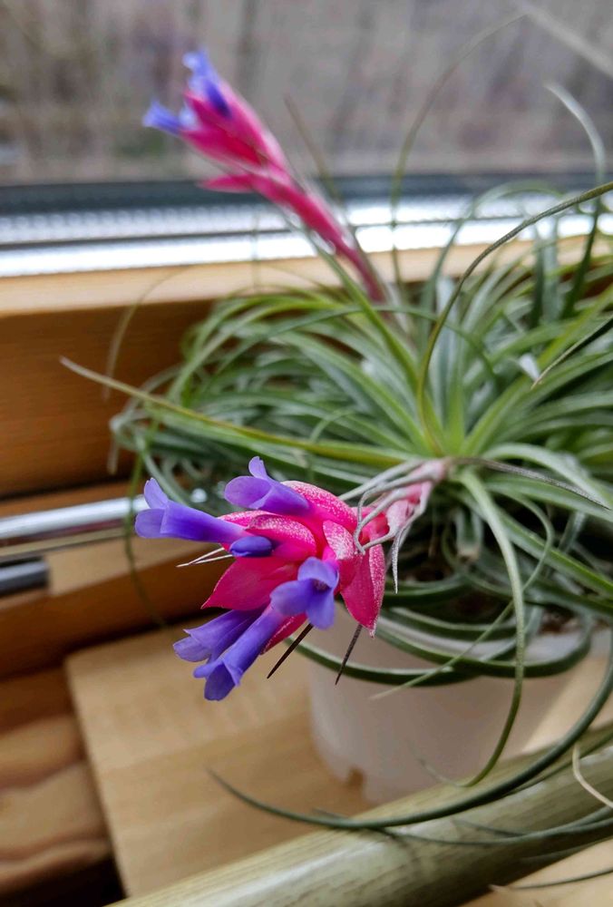 今年は咲かないかな…と思っていたエアプランツのチランジア、ストリクタの花がなんと3つも咲きました😍
