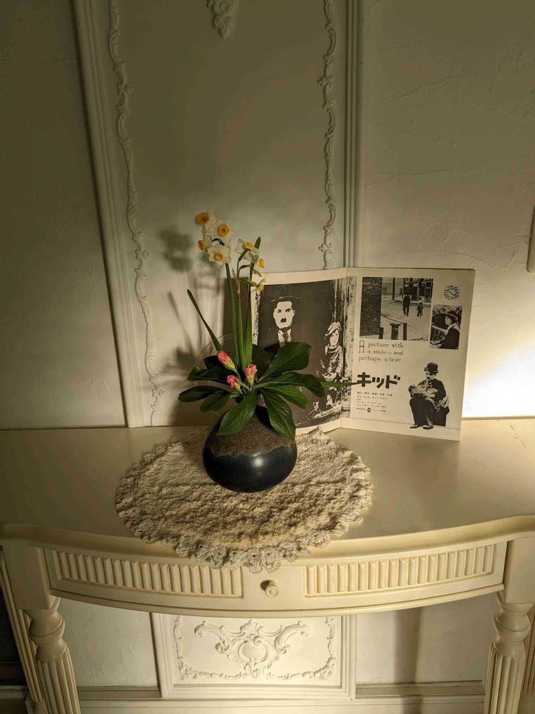 素敵な感じにそれぞれの花材が生かされていて、器との調和も素敵です。スイセンの葉は2枚しか見えないのですが、もっと入っていますか?
